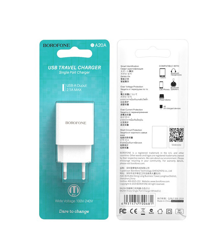 Сетевое зарядное устройство Borofone BA20A обладает стабильным показателем мощности, что обеспечивает быструю зарядку устройства и сводит к минимуму возможные повреждения. Значение силы тока на выходе usb 2,1 A. Детали корпуса выполнены из пластика высокого качества. Порт зарядки надежно зафиксирован в гнезде устройства, рассчитан на длительную производительность, совместим с любым кабелем и позволяет заряжать любое мобильное устройство.