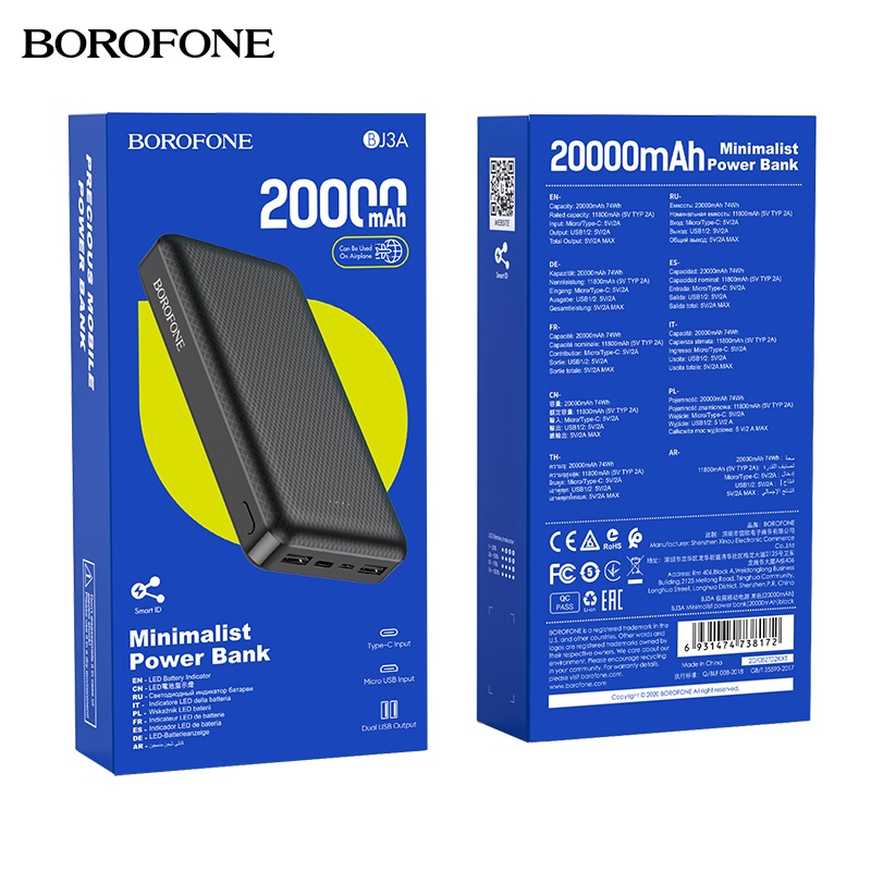 Внешний аккумулятор Borofone BJ3A 20000mAh - это надёжное и простое в использовании портативное устройство. Поможет осуществить подзарядку Вашего устройства во время удаленности от электросети, где бы Вы ни находились. Это незаменимый помощник для активных и деловых людей. Большая производительность аккумулятора, простой, удобный и стильный дизайн обеспечивают быструю зарядку и удобное использование устройства как в повседневной жизни, так и в путешествиях. Обладает высокой мощностью, что позволяет заряжать мобильные телефоны, ноутбуки и планшеты с функциями быстрой зарядки. Данный товар за отличную цену.