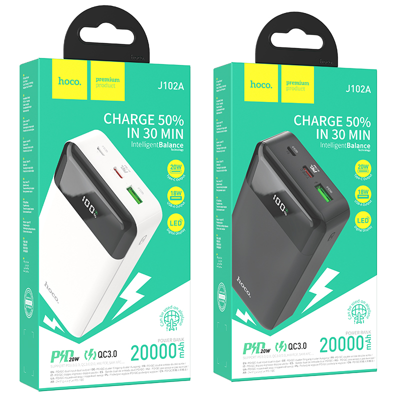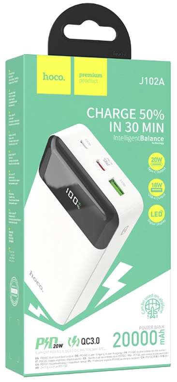 Внешний аккумулятор Hoco J102A – это компактное портативное зарядное устройство емкостью 20000 мАч. Аккумулятор имеет стильный дизайн и 2 выходных порта USB-A и Type-C, позволяющие заряжать одновременно несколько устройств. Благодаря поддержке технологий ускоренной зарядки Quick Charge 3.0 и Power Delivery и выходной мощности до 20W совместимые гаджеты заряжаются быстрее обычного. Hoco J102A изготовлен из качественных и прочных материалов: пластика и поликарбоната, устойчивого к воздействию высоких температур. Классическая матовая поверхность и глянцевая вставка с цифровым LED-дисплеем придает устройству стильный внешний вид. Выполнен в двух цветах.