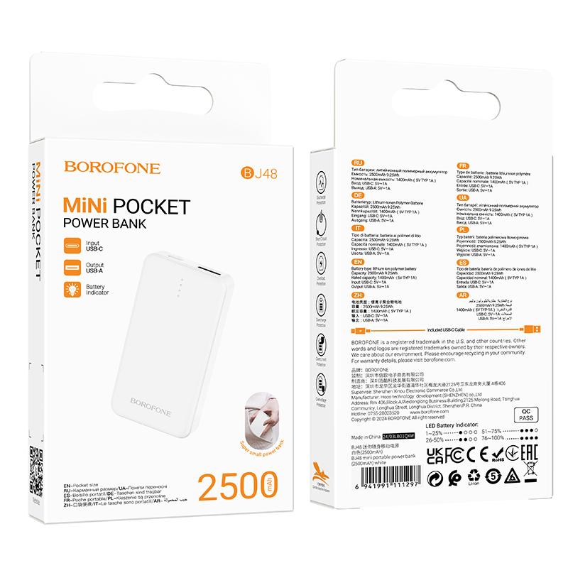Компактный внешний аккумулятор Hoco BJ48 - это портативное устройство, которое позволяет заряжать мобильные устройства, когда нет доступа к электросети. Он оснащен встроенным литий-полимерным аккумулятором емкостью 2500 мАч и двумя портами USB, которые позволяют одновременно заряжать два устройства. Благодаря компактным размерам и небольшому весу, он поместится в любую сумку или рюкзак и не займет много места. Оснащен индикаторами уровня заряда, которые показывают, сколько энергии осталось в аккумуляторе. Hoco BJ48 - это надёжное и простое в использовании портативное устройство, которое поможет осуществить подзарядку вашего устройства где бы вы ни находились. Выполнен в двух цветах.