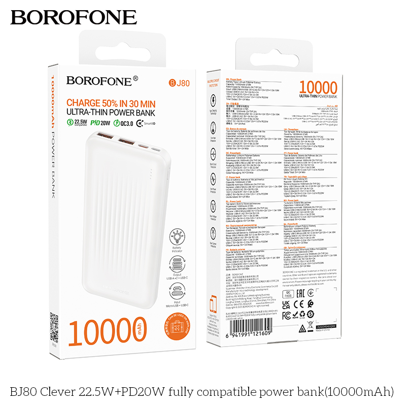 Внешний аккумулятор 10000mAh 2USB+1Type-C+1micro USB 3.0A 22.5W PD 20W+QC3.0 Borofone BJ80