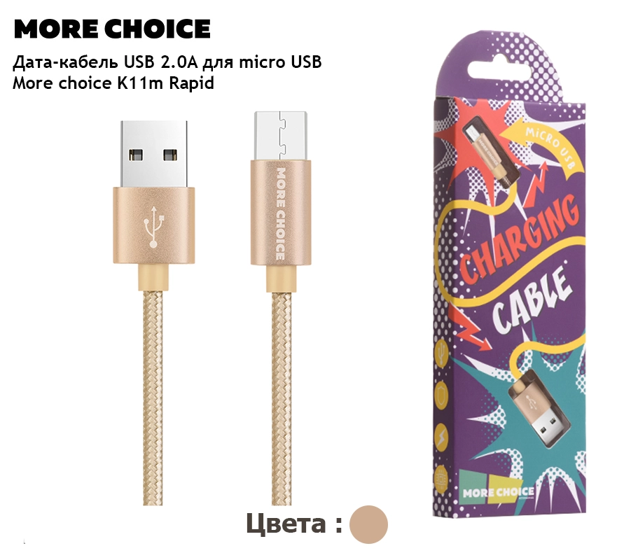 Кабель для зарядки More Choice с разъемом micro USB – универсальный провод питания, идеально подходящий для зарядки различных устройств. Он обеспечивает надежную работу при силе тока 2А и легко подключается к любому устройству с разъемом micro USB, что делает его отличным решением для большинства гаджетов.