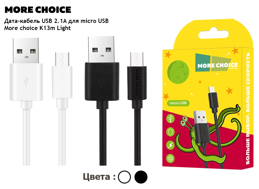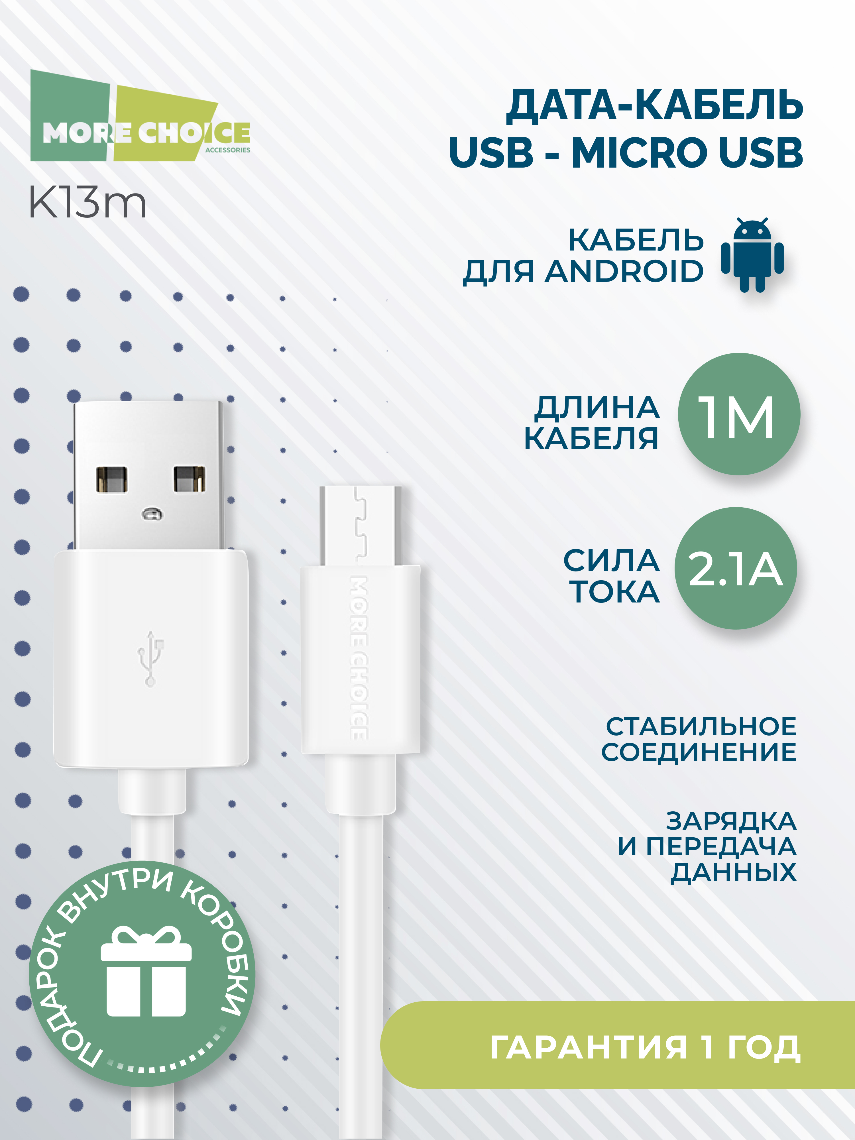 Кабель More Choice с разъемом micro USB подходит для безопасной и стабильной зарядки. Сила тока 2.1А и длина 1 м делают его отличным решением для ежедневного использования.