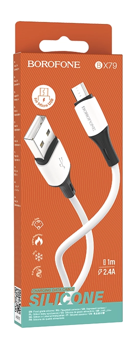 Дата-кабель длиной 1 м поддерживает нагрузку до 2.4 А, а также одновременную зарядку и передачу данных. Силиконовое покрытие обеспечивает прочность, кабель трудно повредить при многократном сгибании. Представлен в черном и белом цветах. Вес 21 г.