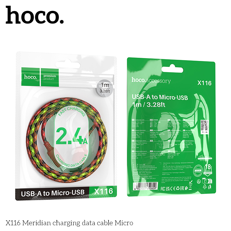 Дата-кабель USB 2.4A для micro USB Hoco X116 нейлон 1м