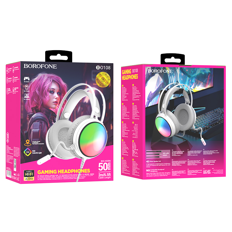 Игровые наушники Borofone BO108 – это стильная гарнитура с объемным звуком, мягкими охватывающими амбушюрами и яркой светодиодной подсветкой. Подойдут для использования не только с компьютером, но и с аудио, видео техникой, телефоном, ноутбуком. Имеют большие динамики 50 мм с отличным качеством звука. Благодаря гибкому микрофону вы сможете принять активное участие в голосовых чатах. Пульт управления расположен на чашке: регулируйте громкость звучания, не тратя время на поиск соответствующих кнопок и регуляторов. RGB-подсветка наушников Borofone BO108 позволят геймерам погрузиться в мир любимых видеоигр. Длина кабеля 2 м дает возможность комфортно расположиться у экрана. Выполнены в двух цветах.
