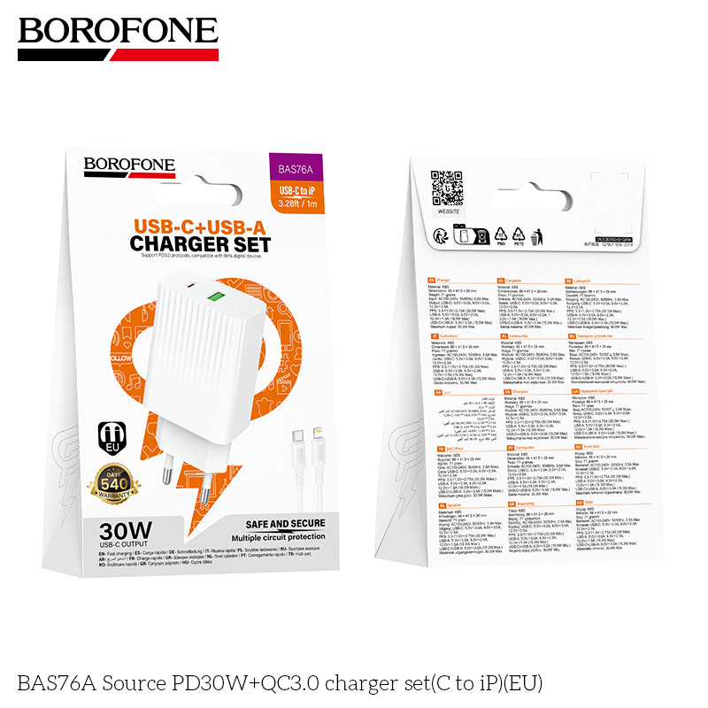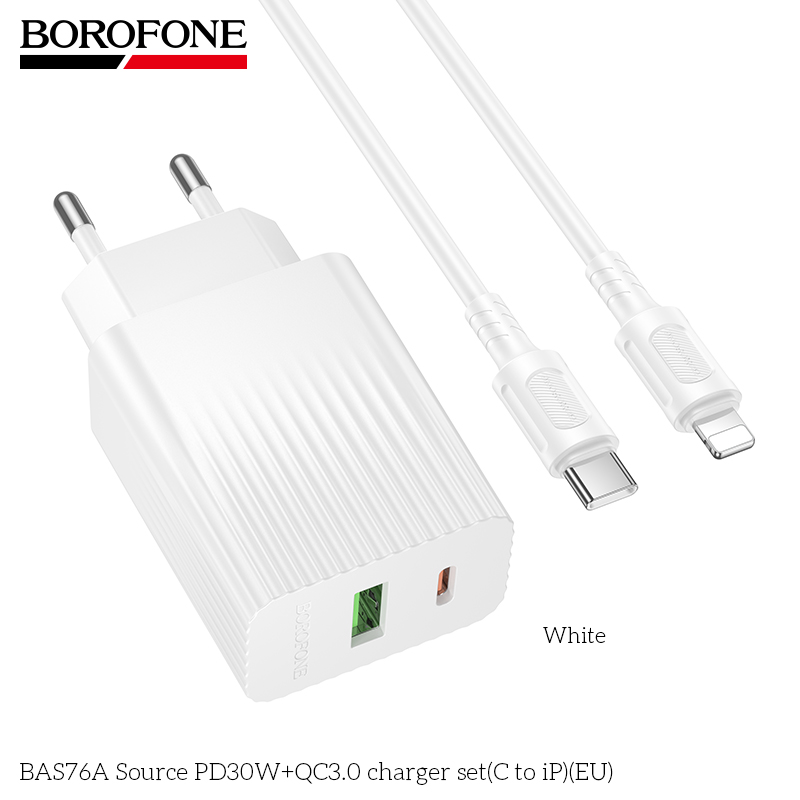 СЗУ 1USB+1Type-C 3.0A PD30W+QC3.0 быстрая зарядка для Lightning 8-pin Type-C Borofone BAS76A