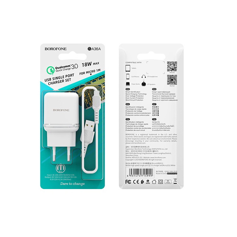 Borofone BA36A - надежное устройство для зарядки телефонов и планшетов. В устройстве предусмотрена многоуровневая система защиты от перегрева, перегрузки и короткого замыкания. Аксессуар поддерживает технологию Quick Charge 3.0, таким образом обеспечивает высокую скорость зарядки. Сила тока составляет 3A при 3,6V - 6,5V, 2A при 6,6V - 9V и 1,5A при 9,1V - 12V. Детали корпуса выполнены из ABC + PC. СЗУ совместим с 99% гаджетов заряжаемых от USB и оснащён интеллектуальной идентификацией подключаемого устройств