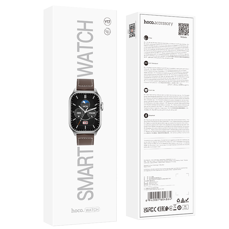 Hoco Y17 - это умные часы, оснащённые сенсорным дисплеем с диагональю 2.03" и разрешением 240*296 пикселей, а также датчиками и полезными функциями, которые помогут следить за показаниями организма и упростят занятия спортом. Смарт-часы совместимы с операционными системами Android и iOS, поддерживают 22 языка, в том числе английский и русский языки. Благодаря двойному Bluetooth 3.0/ 5.0, смарт-часы Hoco Y17 поддерживают сопряжение и полный функционал почти со всеми моделями смартфонов. Встроенный аккумулятор емкостью 300 мАч обеспечит работу часов в течение 5 дней для двойного Bluetooth и 15 дней для одиночного Bluetooth. Кожаный ремешок с регулировкой длины обеспечит комфортную посадку, а практичный корпус имеет степень влагозащиты IP67, что позволит вам не переживать о попадании пыли или влаги в процессе использования смарт-часов.