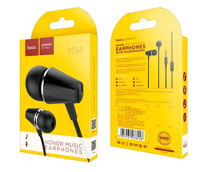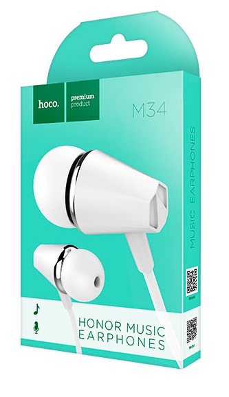 Наушники HOCO M34 Honor отличный универсальный аксессуар. Стильные и удобные наушники с микрофоном и штекером 3,5 миллиметров. Кабель имеет оптимально комфортную длину 1,2 м. Наушники имеют контроллер функционального управления, которые поможет вам отвечать на звонки, не доставая смартфон из кармана, переключать треки и регулировать громкость во время прослушивания музыки. Провод наушников усилен прочным TPE-материалом, поэтому наушники не деформируются в кармане и не надламываются около штекера.