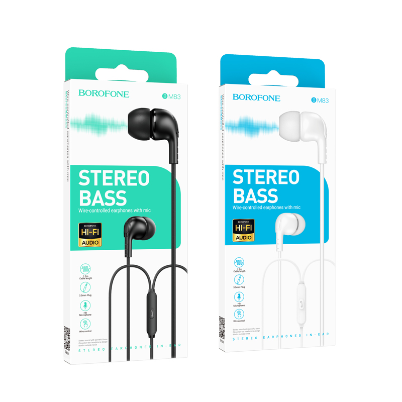 Borofone BM83 - универсальные наушники с микрофоном, аудио штекером 3.5мм и кабелем длиной 1.2м. Вакуумные наушники с отличным звуком для комфортного прослушивания музыки. Эргономичные, легкие и удобные в использовании. Обеспечивают отличное качество звучания и максимальную степень комфорта.