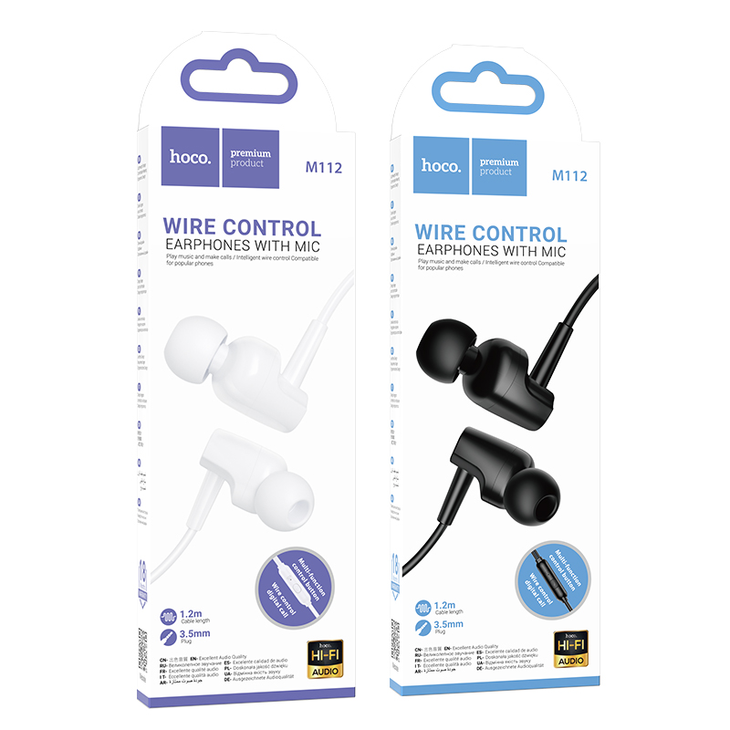 Hoco M112 – это универсальные проводные наушники, которые обеспечивают отличное качество звучания и максимальную степень комфорта. Они совместимы со всей современной электроникой - плеерами, телефонами, компьютерами, имеющими разьем AUX 3.5 мм.Чувствительный микрофон и простое управление обеспечивают удобство при разговоре. Вакуумные наушники имеют вкладыши анатомической формы, за счет этого наушники надежно сидят в ушах и не причиняют никаких неудобств, даже при длительном использовании. Обладают качественным звуком и стильным минималистичным дизайном. На кабеле находится пульт управления с микрофоном и кнопкой для ответа на звонки/воспроизведения музыки. Длина кабеля: 1,2 м; вес: 10 г.