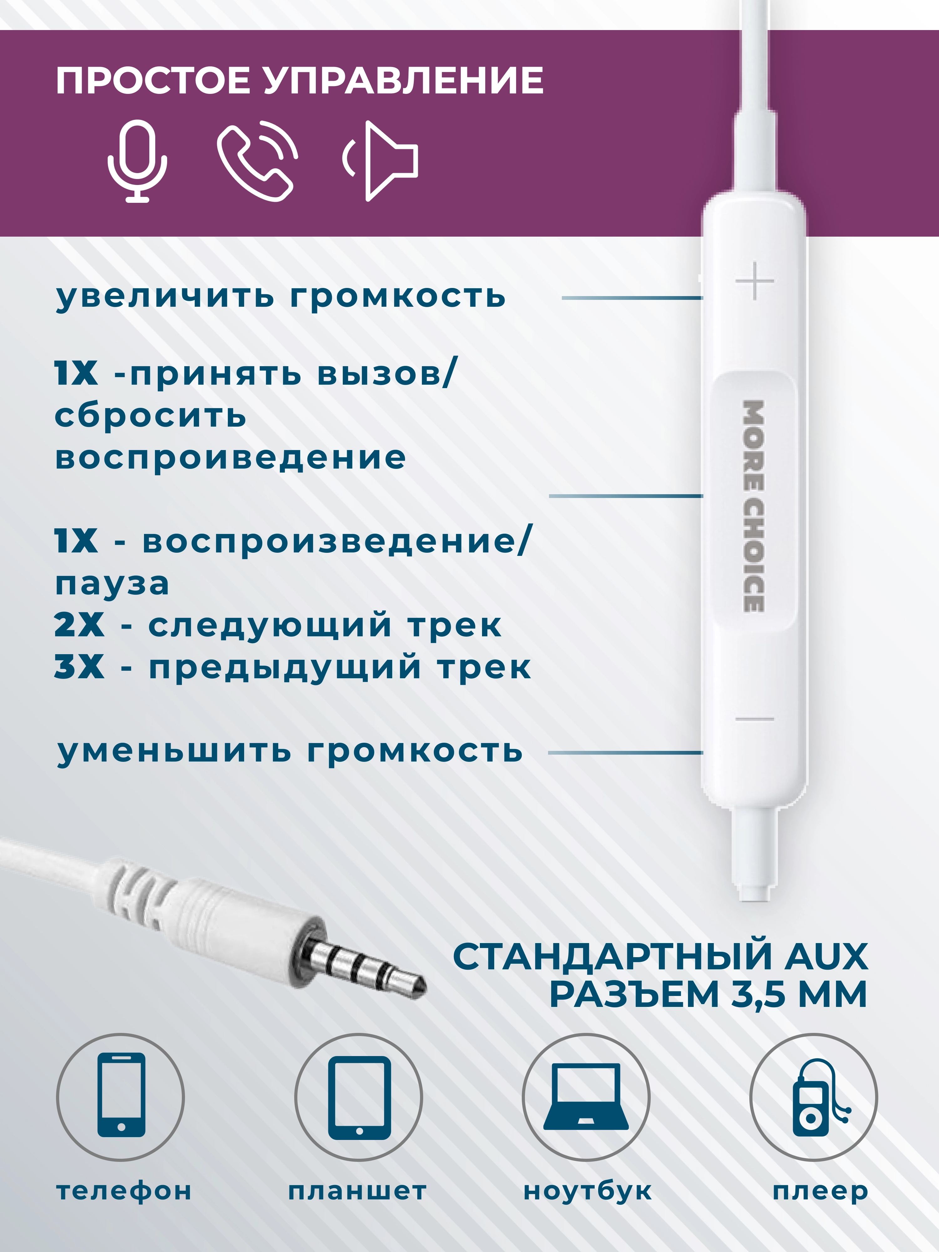 Наушники More Choice — идеальный выбор для тех, кто стремится к высокому качеству звука и комфорту. Эти проводные наушники предлагают надежное соединение и превосходное звучание с чувствительностью 116 дБ и импедансом 32 Ом, что делает их отличным вариантом для прослушивания музыки, просмотра фильмов или общения. Изготовленные из прочных и качественных материалов, они гарантируют долговечность и устойчивость к износу, что особенно важно для активных пользователей. Наушники для телефона имеют встроенный микрофон, позволяющий удобно общаться, не отвлекаясь от других дел. Четкая передача голоса делает их идеальными для деловых переговоров и видеозвонков. Наушники вкладыши обеспечивают надежную и комфортную посадку, позволяя наслаждаться музыкой в течение длительного времени без дискомфорта. С разъемом AUX вы сможете легко подключить их к любому устройству, что делает их универсальным аксессуаром для повседневного использования. Наушники с микрофоном More Choice — ваш надежный спутник в мире звука.