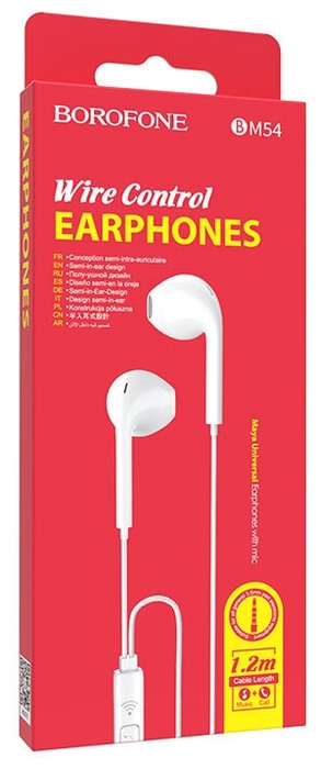 Наушники Borofone BM54 - стильные наушники с вкладышами эргономичной формы. Подключаются к гаджетам в разъем 3.5 мм. Вкладываются точно внутрь уха, располагаются не так близко к барабанной перепонке, как внутриканальные, и не вызывают дискомфортных ощущений при продолжительном ношении.