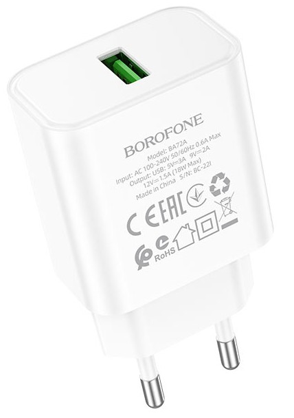 Borofone BA72A - это сетевое зарядное устройство с одним выходом USB-A и поддержкой стандарта быстрой зарядки QC 3.0, которое быстро и безопасно зарядит ваши устройства. Поддерживает силу тока до 3 А и обладает стабильным показателем мощности 18 Вт, что обеспечивает быструю зарядку устройства и сводит к минимуму возможные повреждения. Корпус изготовлен из огнестойкого пластика ABS + PC. Выполнено в двух цветах.