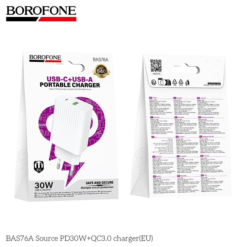 СЗУ 1USB+1Type-C 3.0A PD 30W+QC3.0 быстрая зарядка Borofone BAS76A