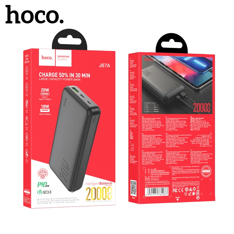 Очень часто в повседневной жизни в неожиданный момент телефон может разрядиться, есть удобное для этого решения внешний аккумулятор Hoco J87 емкостью 20000mAh. Оснащен материалом корпуса в виде пластика с LED-индикатором.