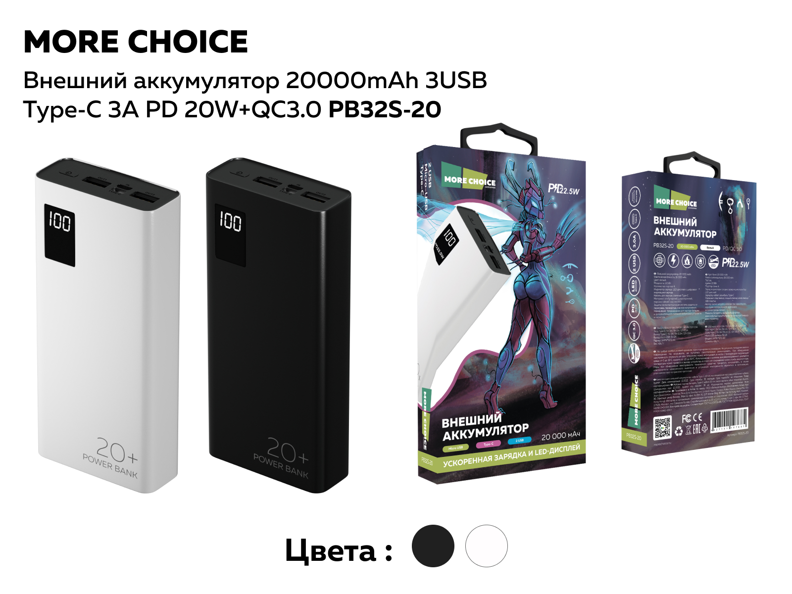 Портативное зарядное устройство More Choice PB32S-20 — идеальный помощник для зарядки ваших устройств в любых условиях: дома, в офисе или в поездке. С емкостью 20000 mAh этот повербанк обеспечивает быструю и эффективную зарядку для телефонов, планшетов и других гаджетов, а функция быстрой зарядки позволяет заряжать устройства в два раза быстрее, чем обычные аккумуляторы.