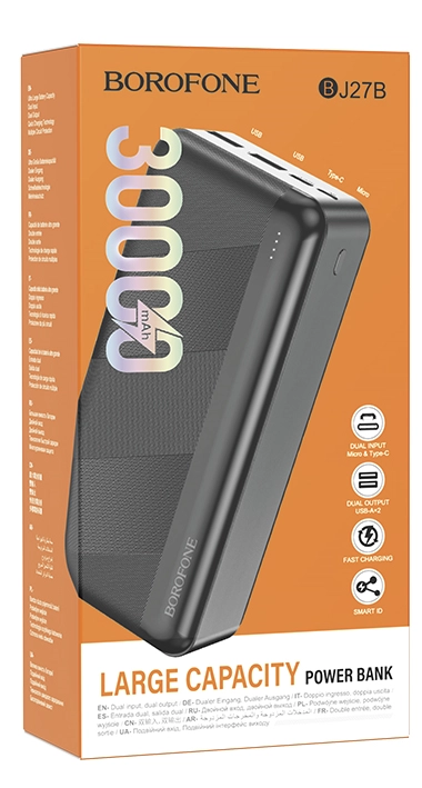 Внешний аккумулятор Borofone BJ27B 30000mAh - это надёжное и простое в использовании портативное устройство. Поможет осуществить подзарядку Вашего устройства во время удаленности от электросети, где бы Вы ни находились. Это незаменимый помощник для активных и деловых людей. Большая производительность аккумулятора, простой и удобный дизайн, обеспечивают удобное использование устройства как в повседневной жизни, так и в путешествиях.