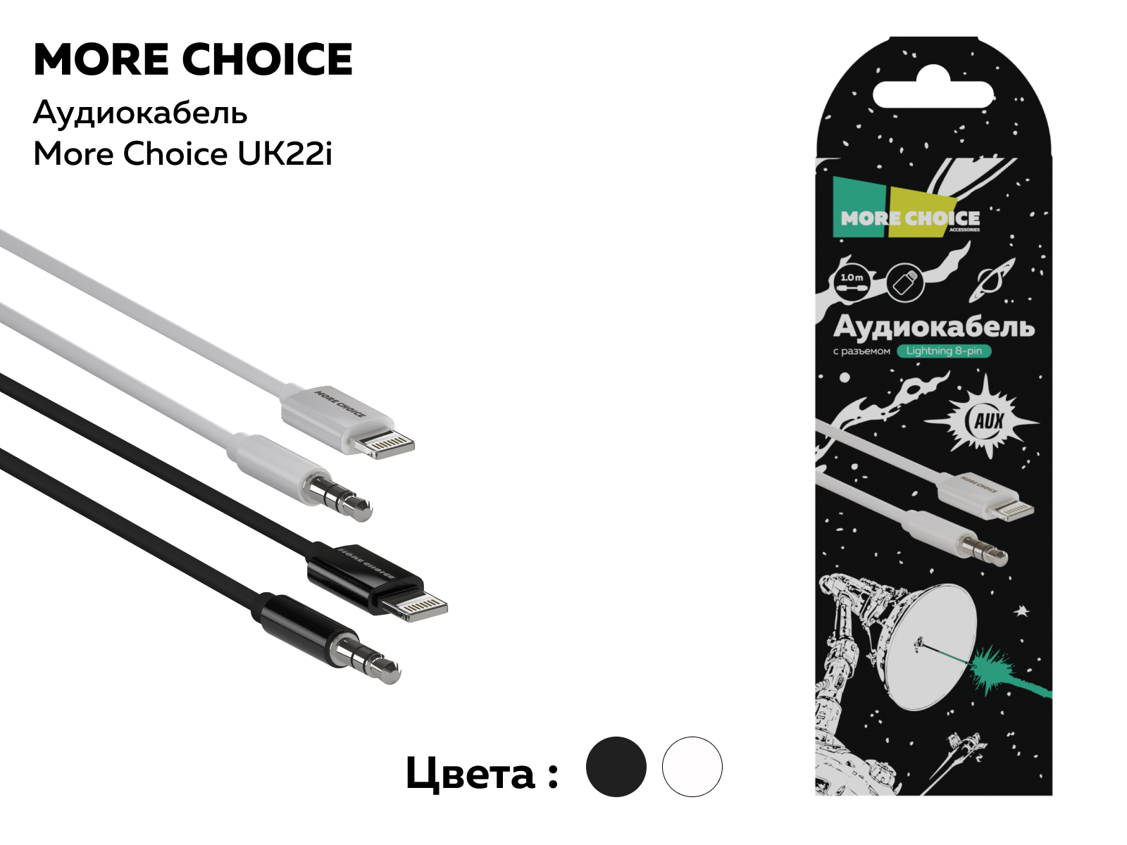 Также поддерживает устройства с Lightning разъемом, что расширяет его совместимость и функциональность. More Choice — это надежный аудиокабель для всех типов устройств, обеспечивающий долговечность и удобство.