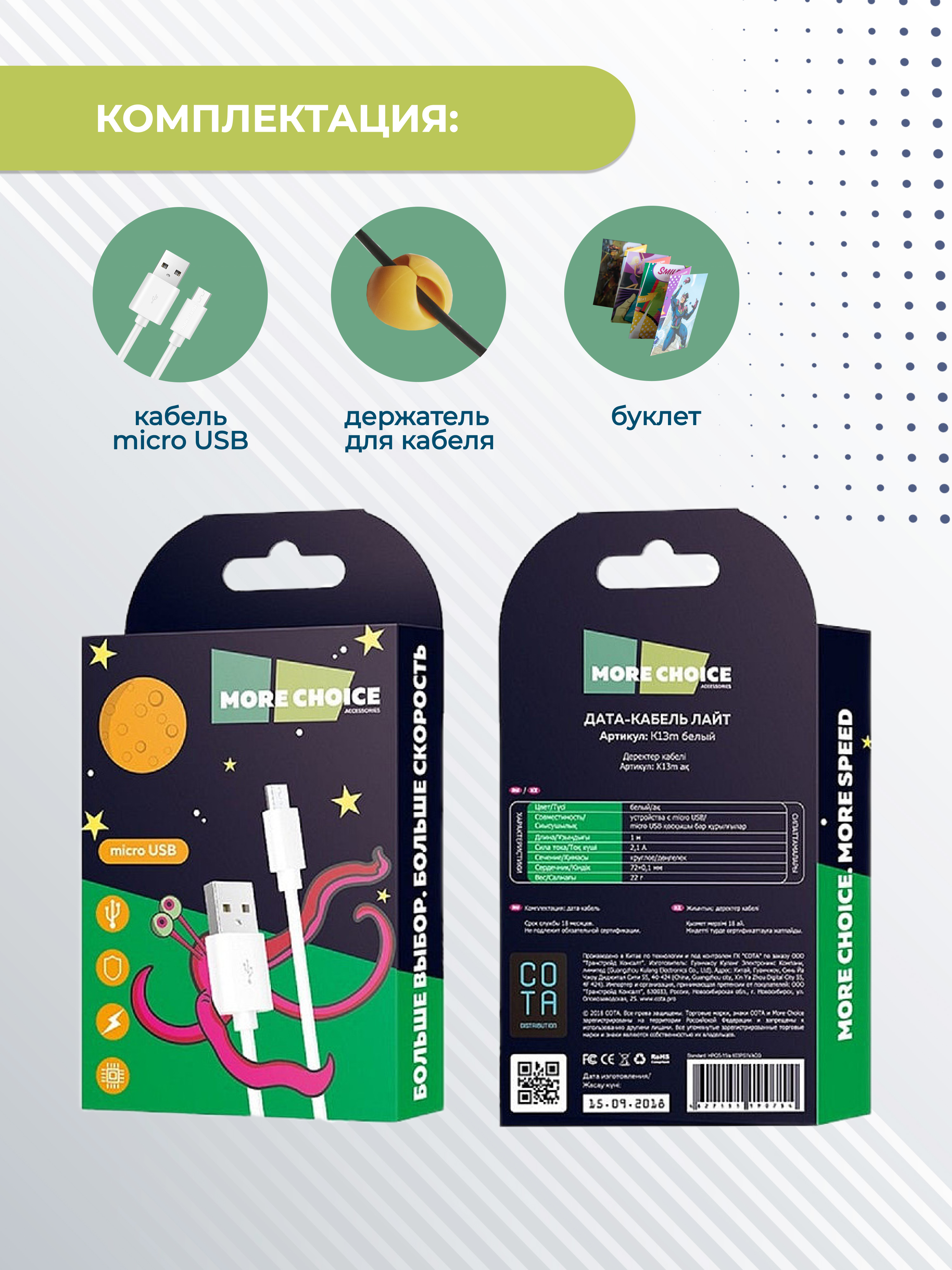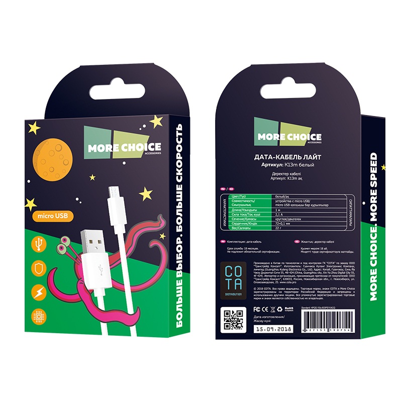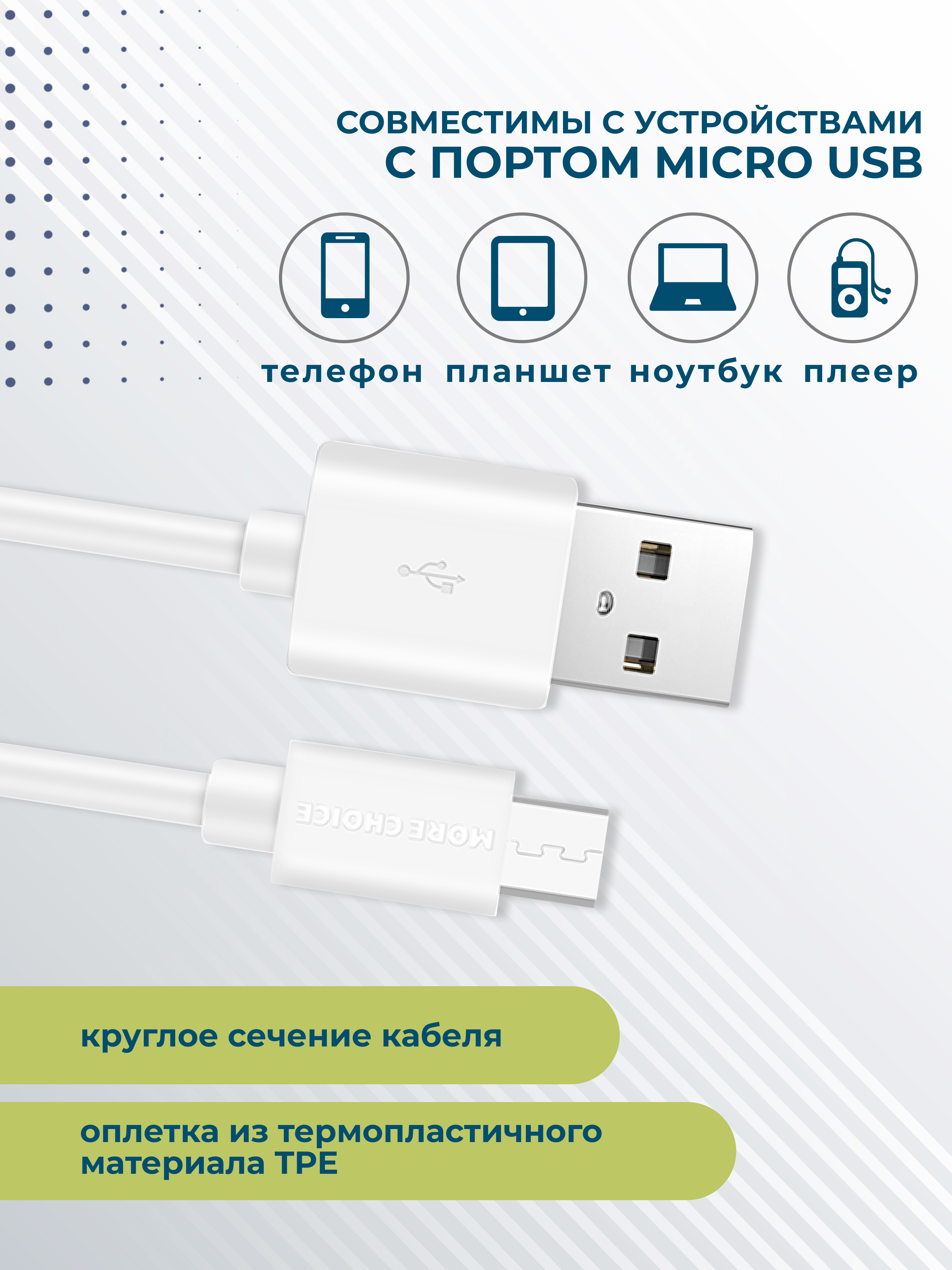 Кабель More Choice с разъемом micro USB подходит для безопасной и стабильной зарядки. Сила тока 2.1А и длина 1 м делают его отличным решением для ежедневного использования.