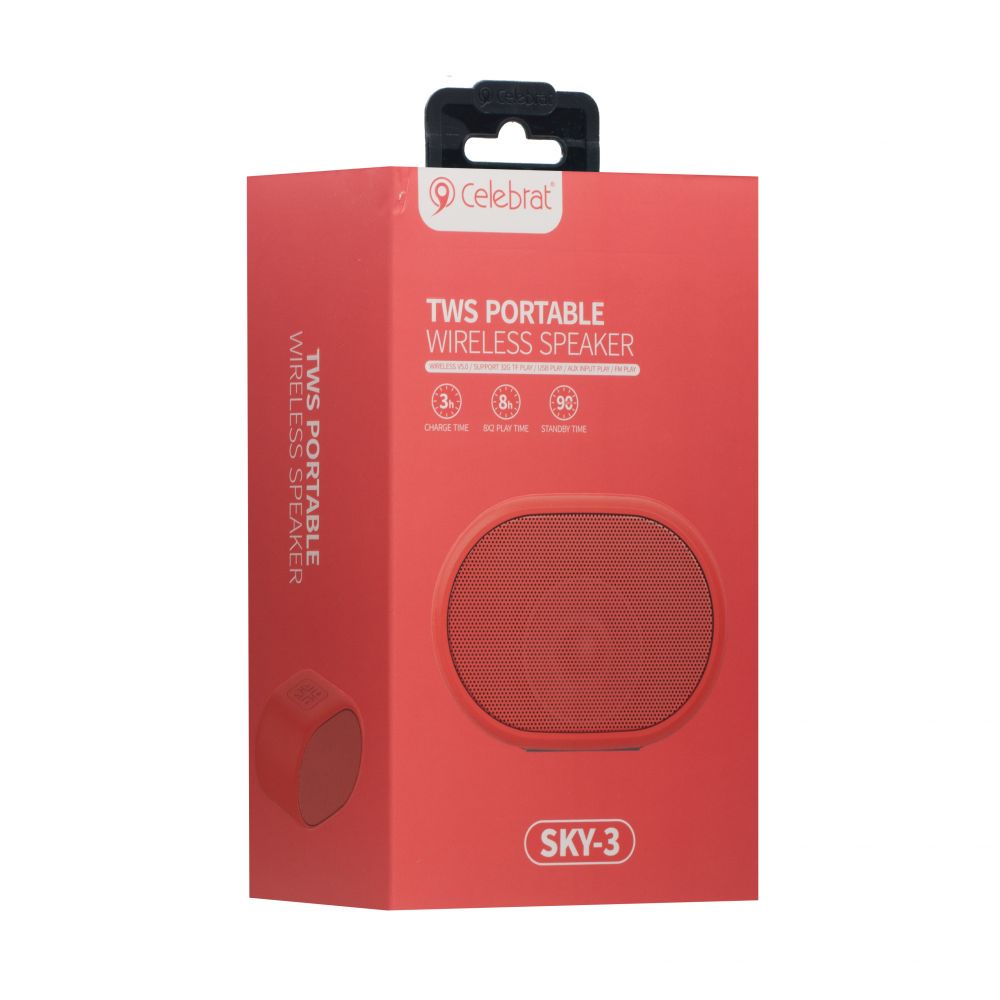 Портативная bluetooth колонка Celebrat SKY-3 - модель с ярким дизайном и реалистичный звуком, передающим все нюансы музыкальных композиций. В колонку встроено FM радио и микрофон для использования устройства в качестве гарнитуры. Модель имеет небольшой вес и компактные размеры, изготовлена из приятного на ощупь, прочного пластика с soft touch покрытием. Встроенный аккумулятор емкостью 1200 mah обеспечивает непрерывную работу колонки в течение 8 часов. Подзарядка батареи осуществляется от стационарной электросети или компьютера. Устройство оснащено bluetooth 5.0, слотом для карт памяти, usb портом, разъёмами aux и micro-usb. Аксессуар можно использовать как внешний аккумулятор для подзарядки разных гаджетов. Комплектуется кабелями aux, micro-usb и ремешком, который позволяет с комфортом брать устройство с собой, например, на прогулки.