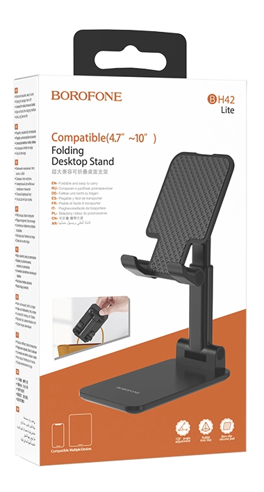 Универсальная настольная подставка-держатель для смартфонов и планшетов с диагональю от 4.7 до 10 дюймов. Размер: в сложенном виде 65*110*28 мм; в развернутом виде 65*110*165 мм. Вес: 116 гр.
