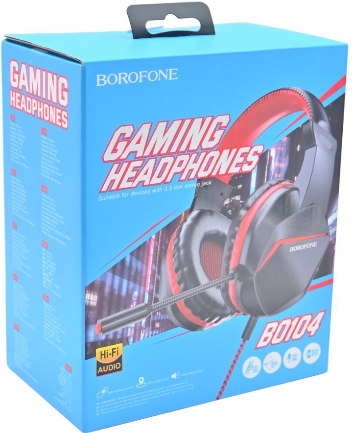 Полноразмерные проводные наушники BO104 с микрофоном, предназначенные для игр, оснащены регулятором громкости на кабеле. Длина кабеля 220 см. Диаметр динамиков 50 мм. Поддерживаемый диапазон частот 20 - 20 000 Гц. Разъём подключения - AUX 3.5 мм и USB. Основной цвет наушников - чёрный, дополнительные - синий или красный.