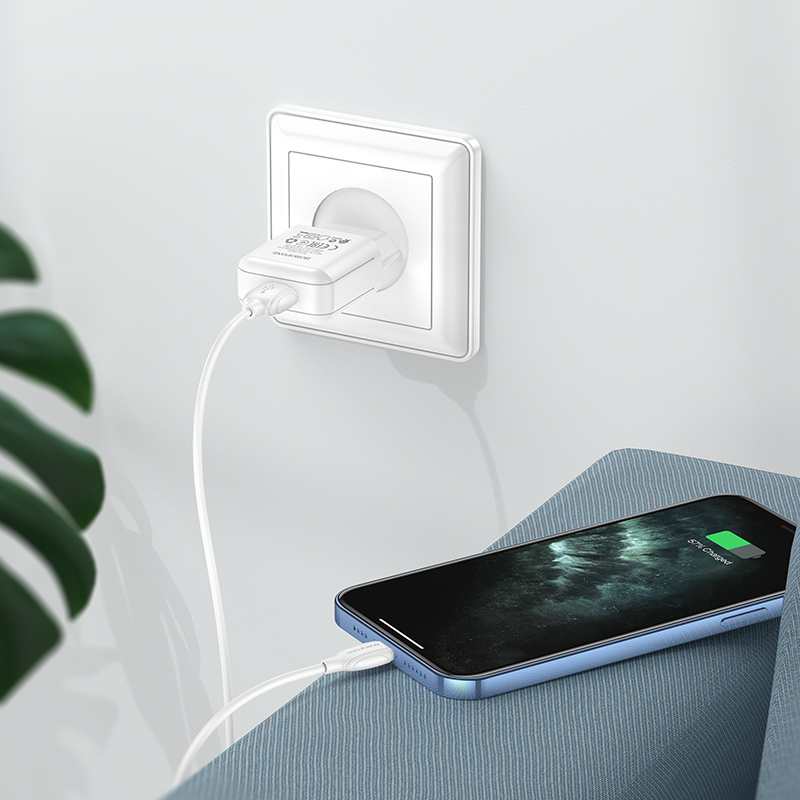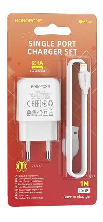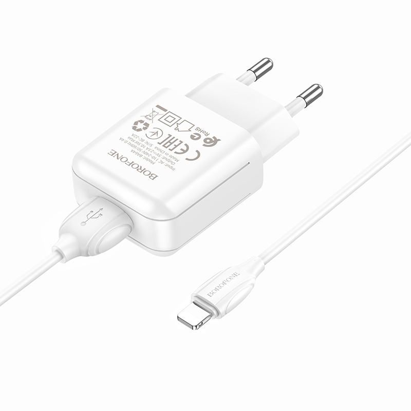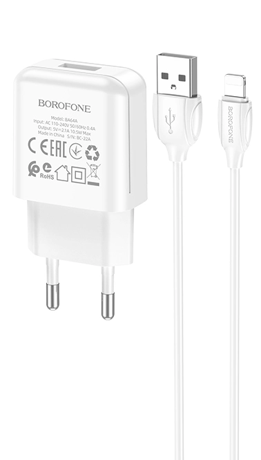 Сетевое зарядное устройство Borofone BA64A обладает стабильным показателем мощности, что обеспечивает быструю зарядку устройства и сводит к минимуму возможные повреждения. Значение силы тока на выходе USB 2,1 A. Детали корпуса выполнены из пластика высокого качества. Порт зарядки надежно зафиксирован в гнезде устройства, рассчитан на длительную производительность. Комплектуется кабелем Lightning 8-pin длиной 1 м.