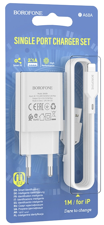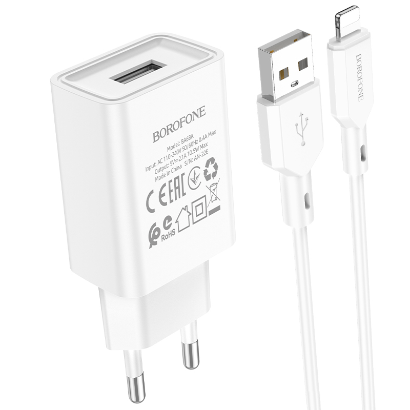 Сетевое зарядное устройство Borofone BA68A имеет один USB порт c максимальной силой тока 2.1 А. Оснащен материалом огнестойким, что не позволяет перегреваться. Длина 1м, вес 41гр.