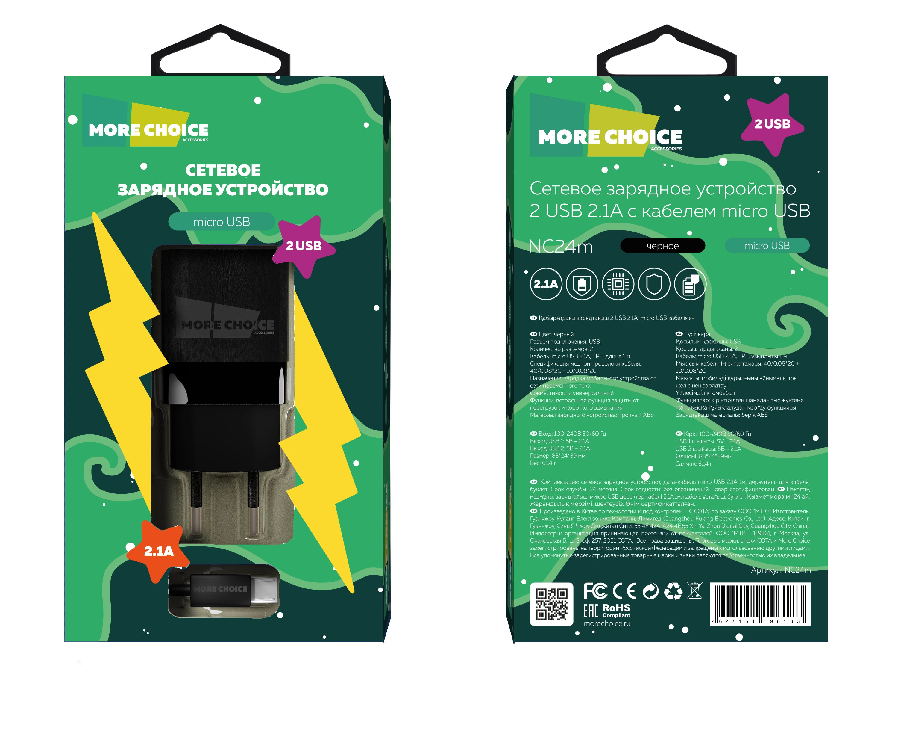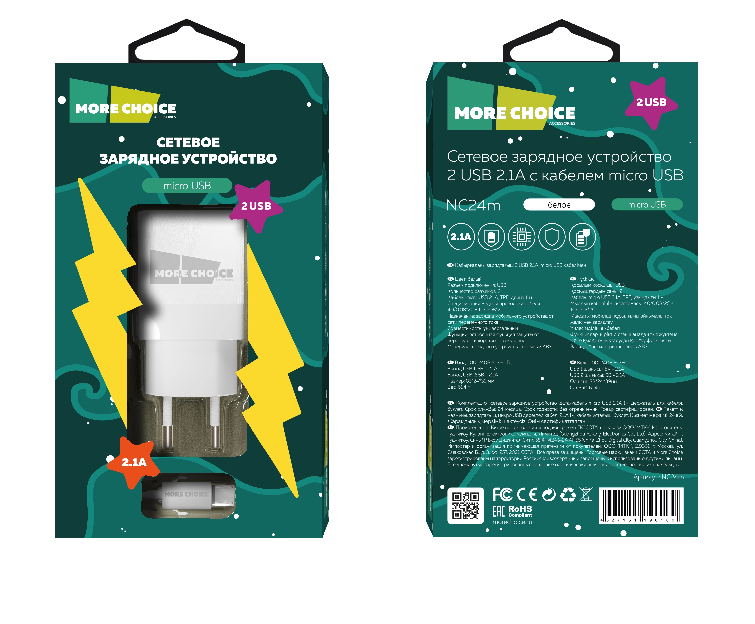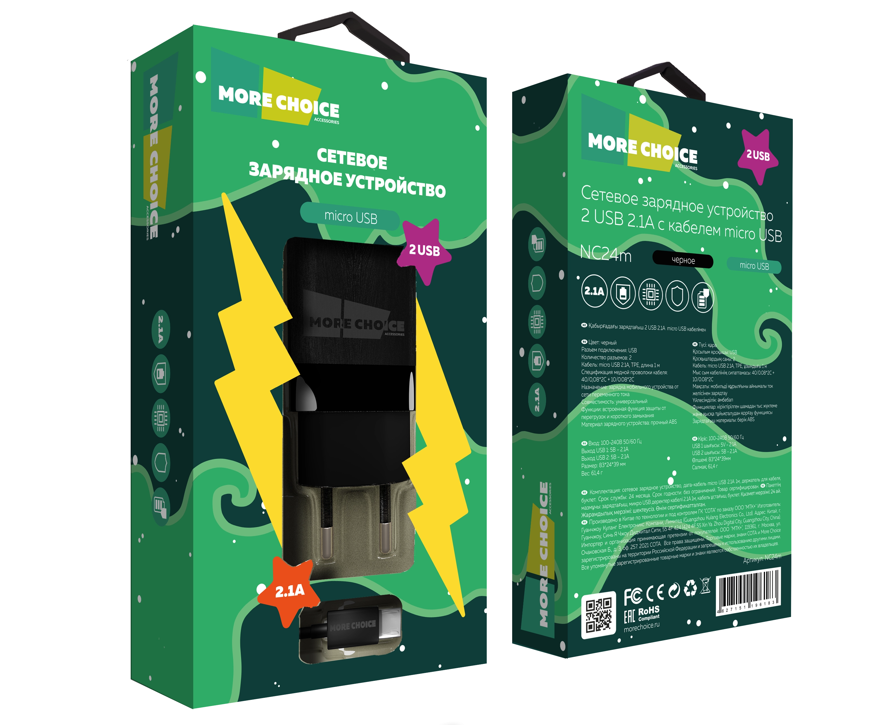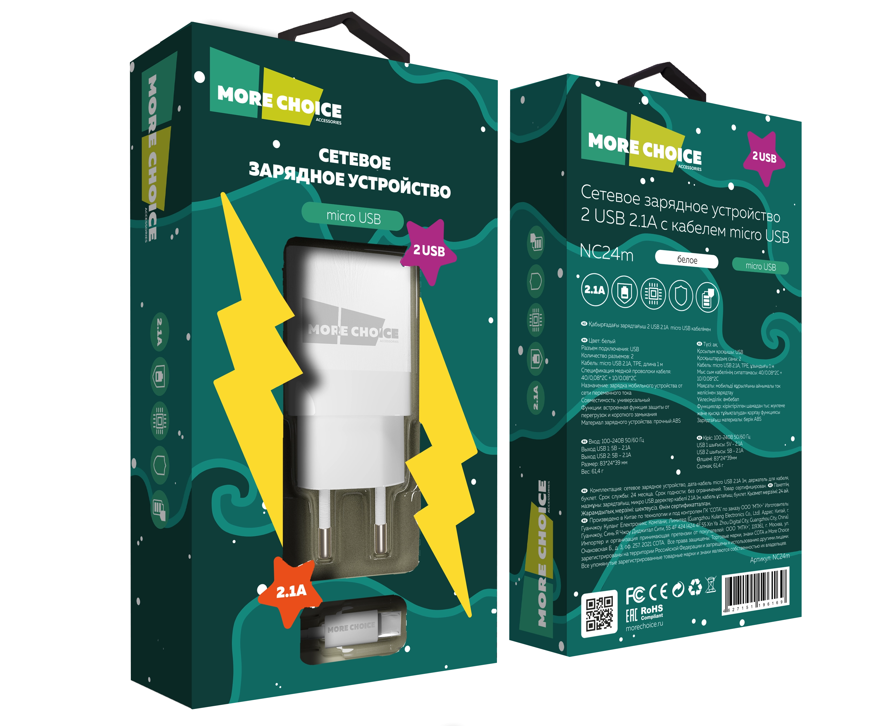 Сетевое зарядное устройство More Choice — универсальное устройство для быстрой, безопасной и стабильной зарядки. С мощностью 2.1А оно ускоряет процесс зарядки даже гаджетов с большими батареями, таких как смартфоны и планшеты.