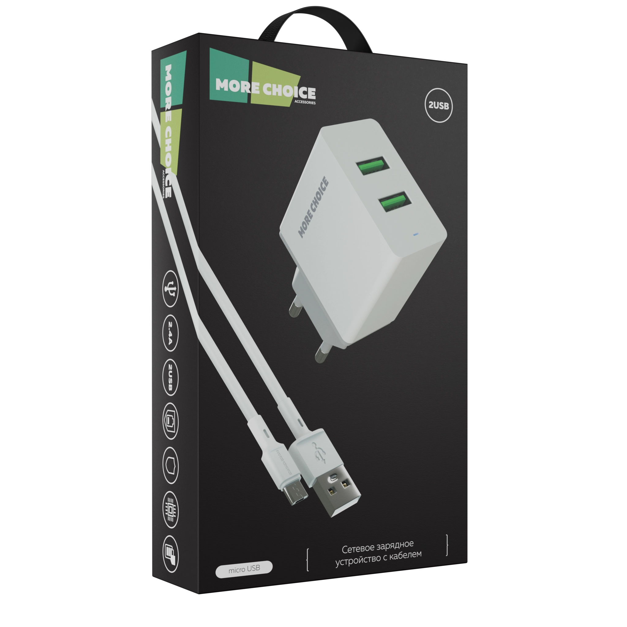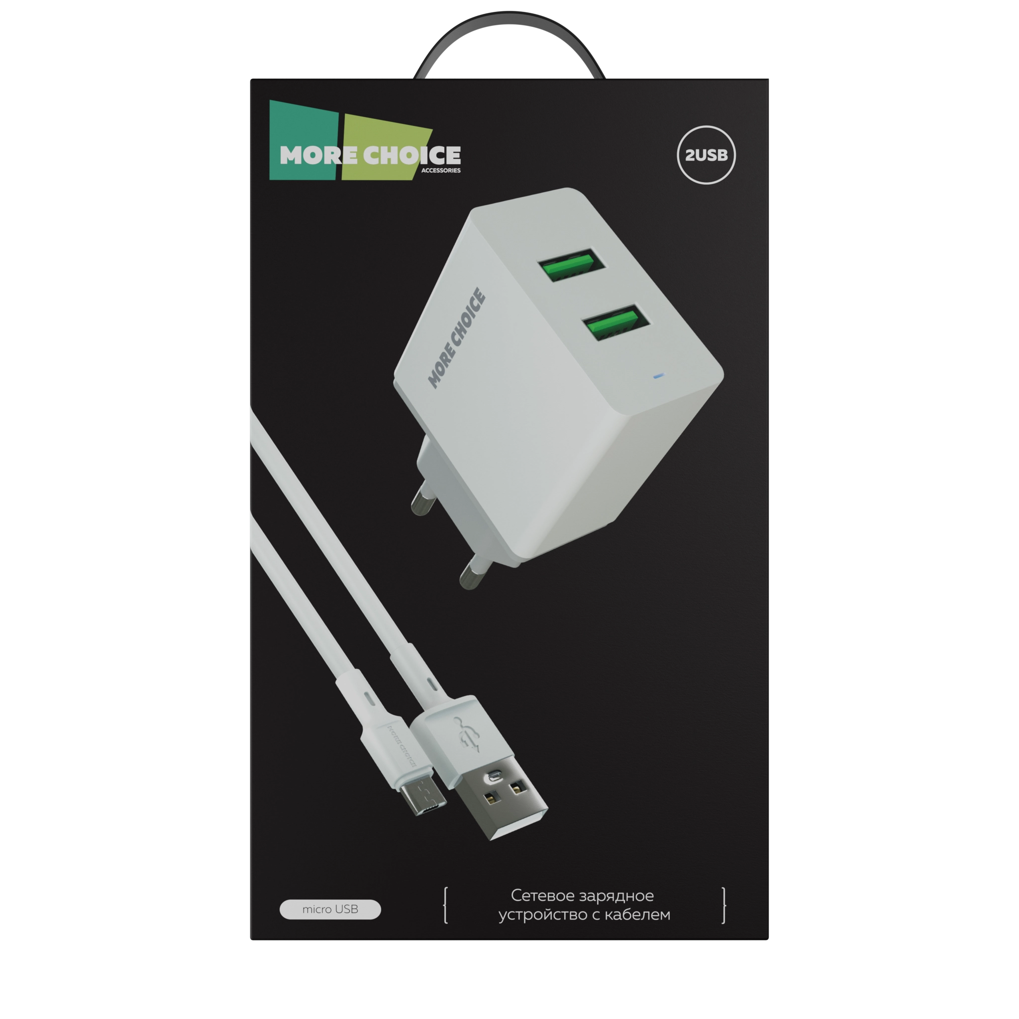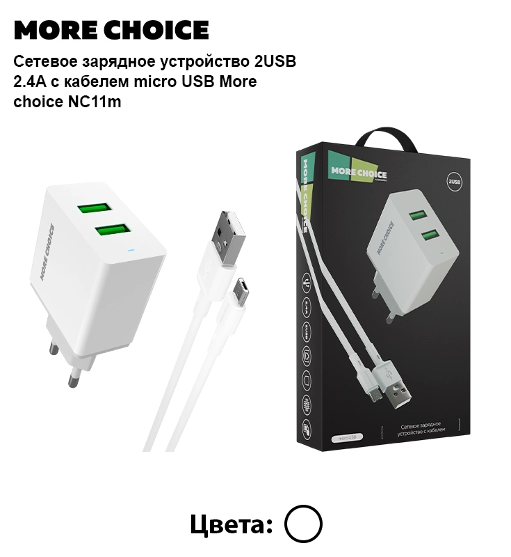 Сетевое зарядное устройство More Choice оснащено двумя разъемами USB-A, что делает его универсальным и совместимым с большинством современных гаджетов.